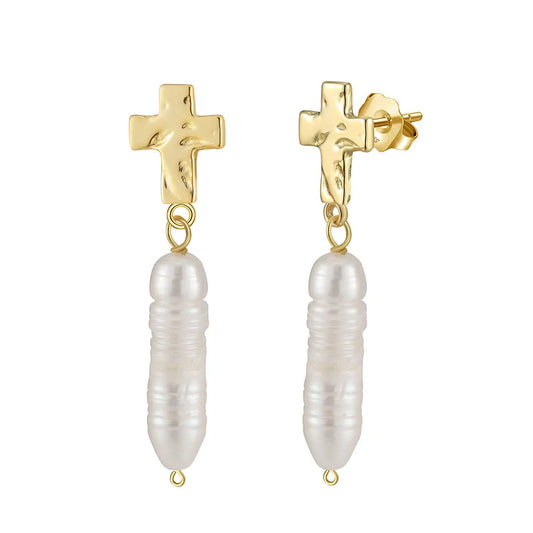 Silver Baroque Pearl Cross Earrings