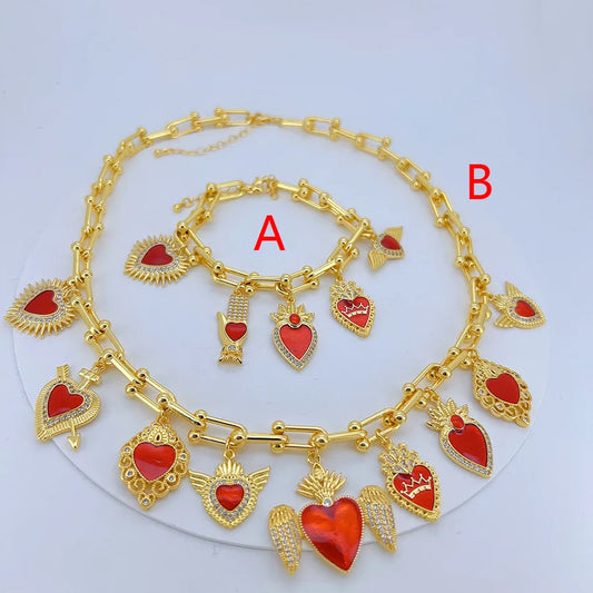 Gold-Plated Heart & Crown Zircon Necklace & Bracelet Set