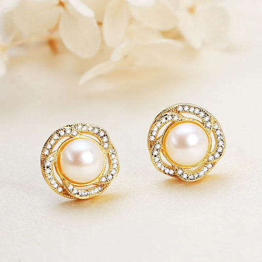 White Gold Geometric Shell Pearl & Zircon Stud Earrings