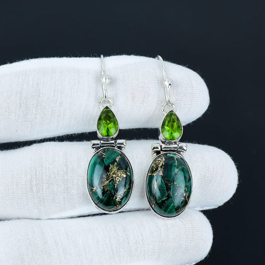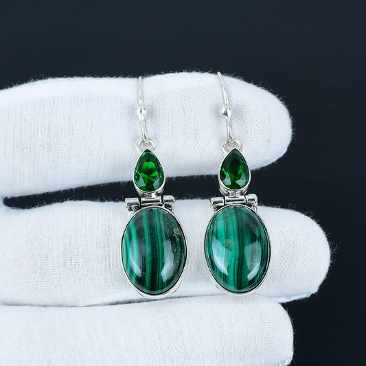 Green Malachite & Tourmaline Sterling Silver Drop Earrings