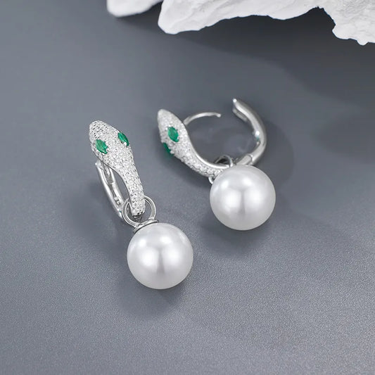 White Gold Plated Snake Shell Pearl Hoop Earrings