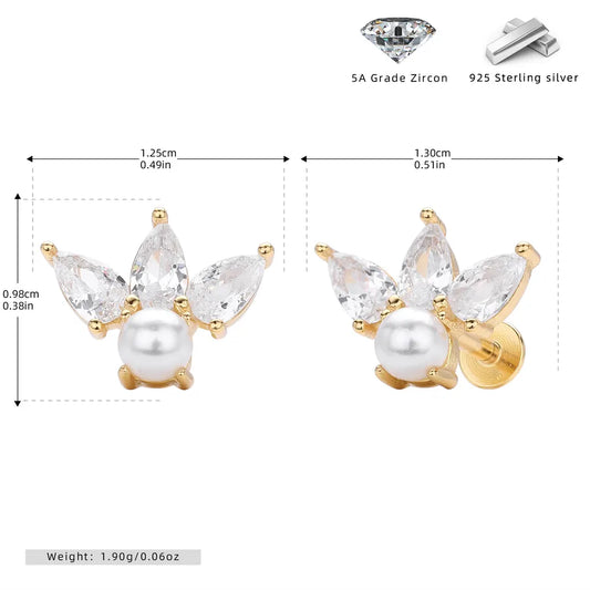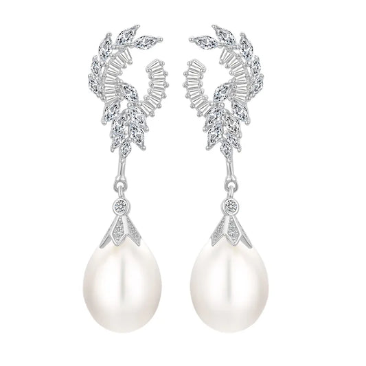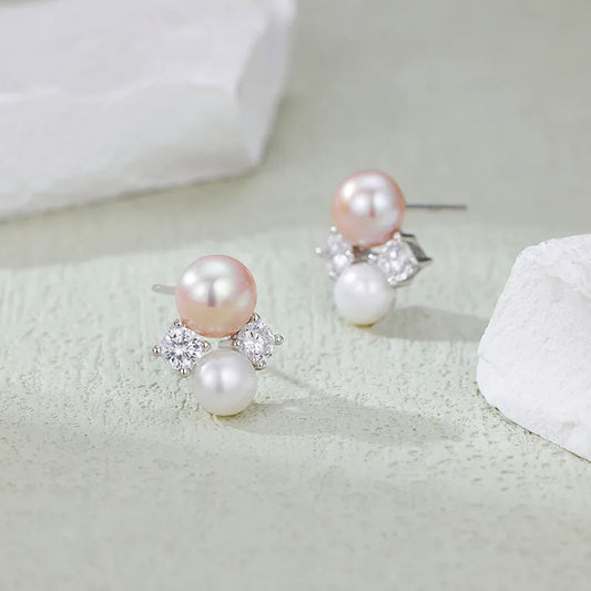 Sterling Silver White Gold Plated Pearl Zircon Stud Earrings