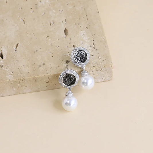 White Gold Plated Geometric Pearl & Zircon Stud Earrings