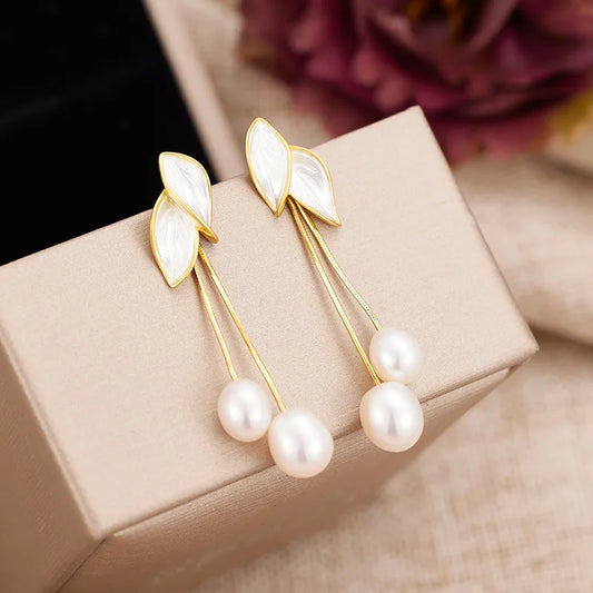 Gold-Plated Leaf Drop Earrings with White Pearls