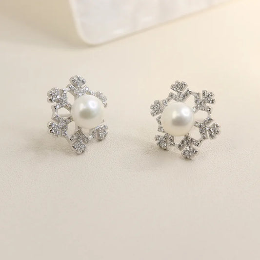 White Gold Plated Pearl & Zircon Snowflake Stud Earrings