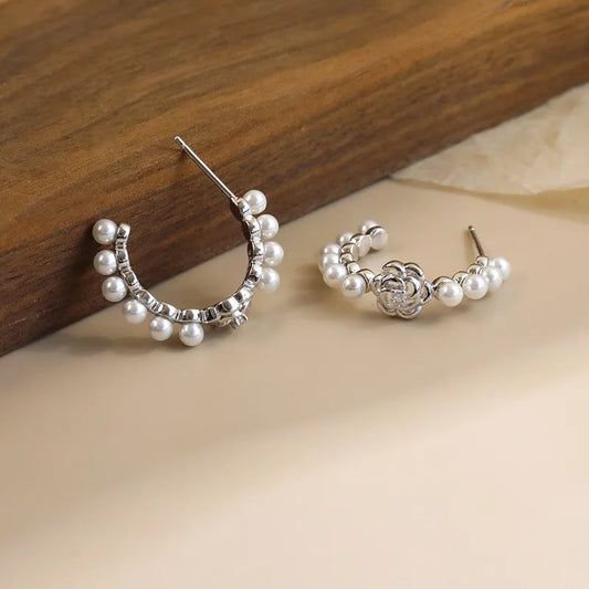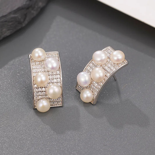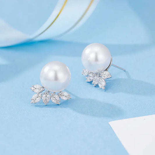 White Gold Geometric Shell Pearl & Zircon Stud Earrings