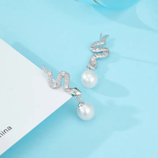 Gold-Plated Sterling Silver Snake Drop Earrings with White Pearl & Zircon