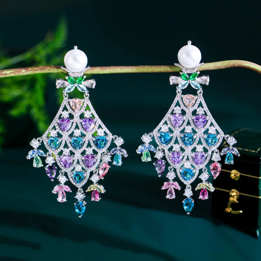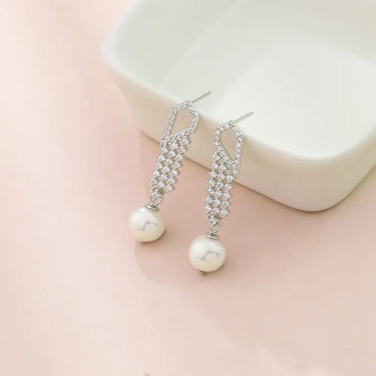 White Gold Plated Pearl & Zircon Tassel Drop Earrings