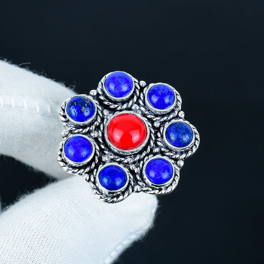 Red Coral & Lapis Lazuli Sterling Silver Ring
