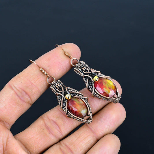 Multicolor Ammolite Gemstone Copper Wire Wrapped Dangle Earrings