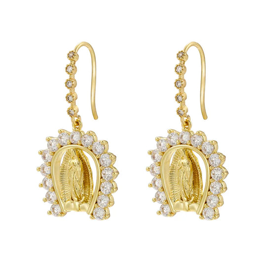 18k Gold Virgin Mary Zircon Drop Earrings