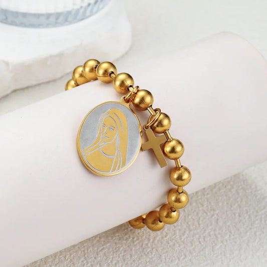 Gold-Plated Beaded Virgin Mary Heart Bracelet