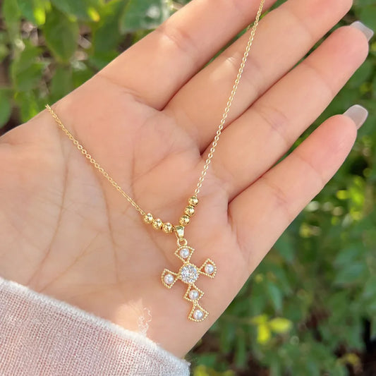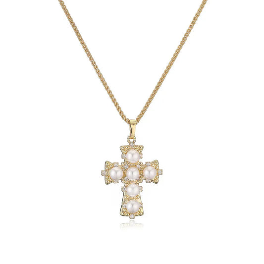 Gold Cross Pendant Necklace with Pearls and Zircon