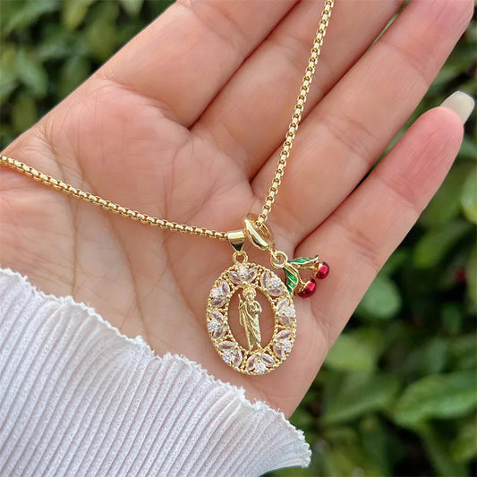 Gold-Plated Virgin Mary Cherry Rose Pendant Necklace