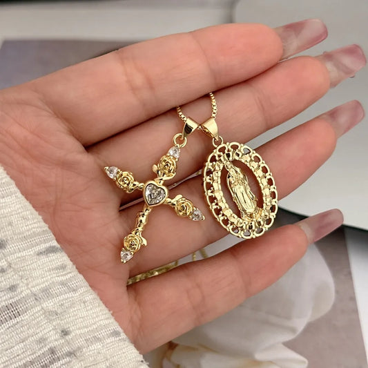 Gold-Plated Zirconia Virgin Mary Cross Pendant Necklace