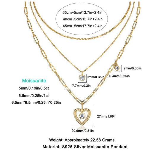 925 Sterling Silver Moissanite Paperclip Chain cable chain Inlay Heart Shape GRA Certificate Three Layer Necklace