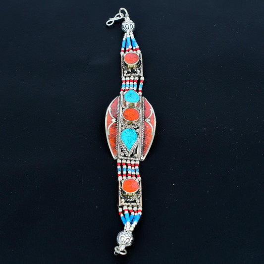 Red Coral & Turquoise Gemstone Sterling Silver Bracelet