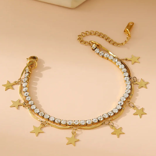 Silver Layered Cross, Star & Leaf Rhinestone Bracelet