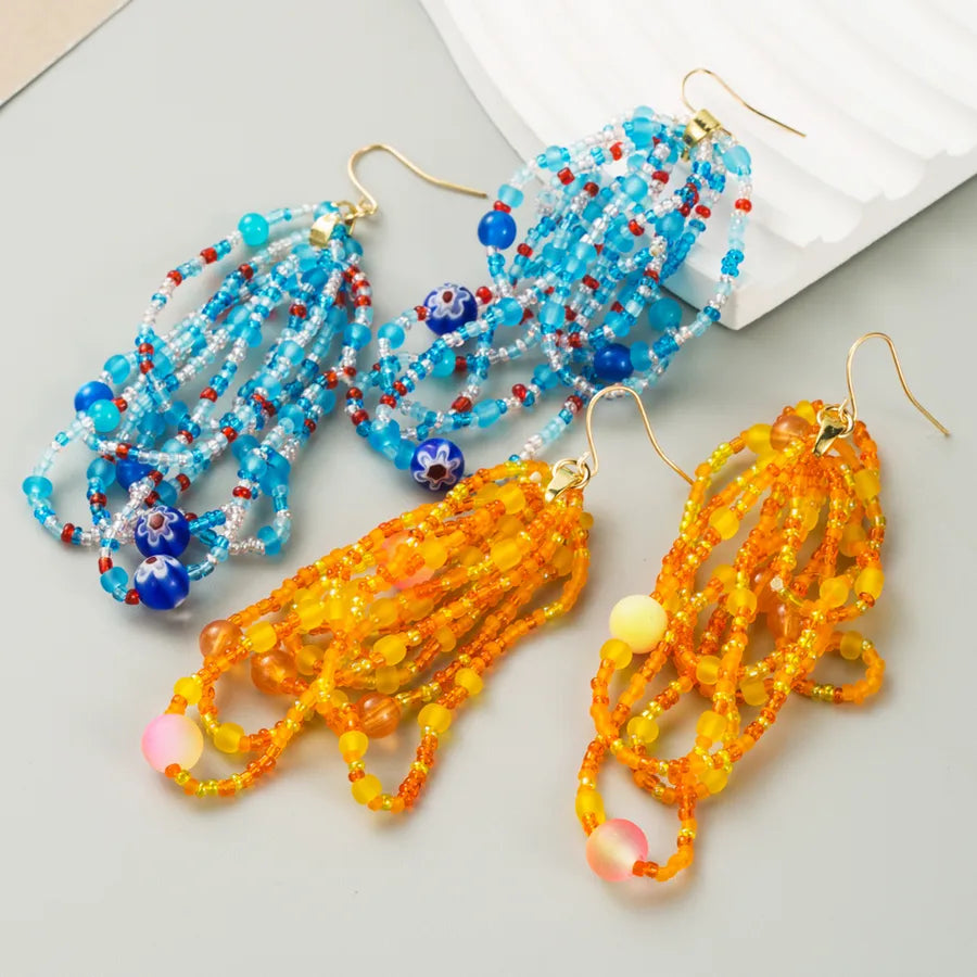 Featuring an array of vibrant beads intricately woven into playful strands, these earrings are perfect for adding a pop of color to any outfit. Choose between a delightful blue design with floral accents or a sunny yellow-orange combination.