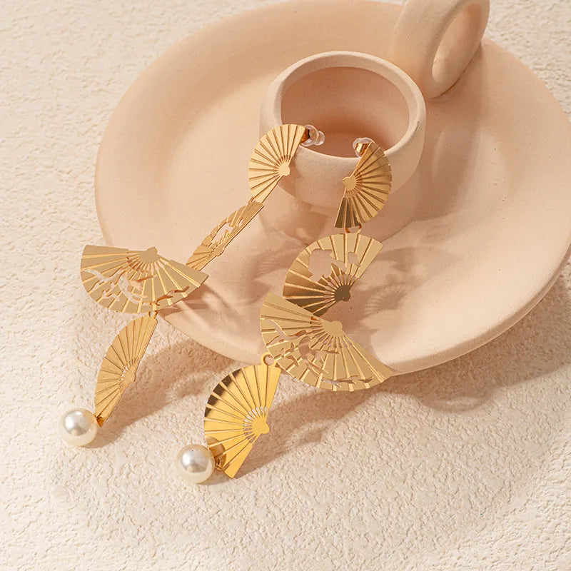 Elevate your elegance with these exquisite gold fan-shaped earrings. Crafted with intricate detailing, each piece gracefully cascades with a series of fans, creating a dynamic display of movement and style.