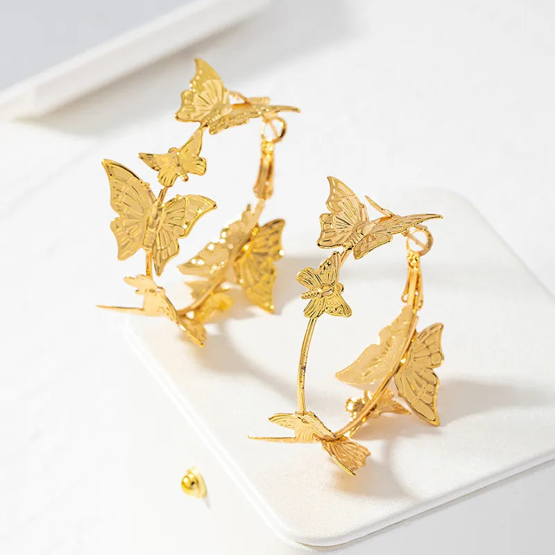 Crafted from high-quality gold-plated metal, each hoop is adorned with delicately detailed butterflies, symbolizing transformation and grace.