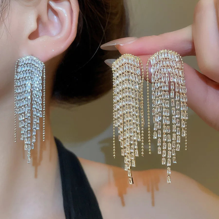 Featuring dazzling strands of shimmering gems, these earrings gracefully drape down, reflecting light with every movement.