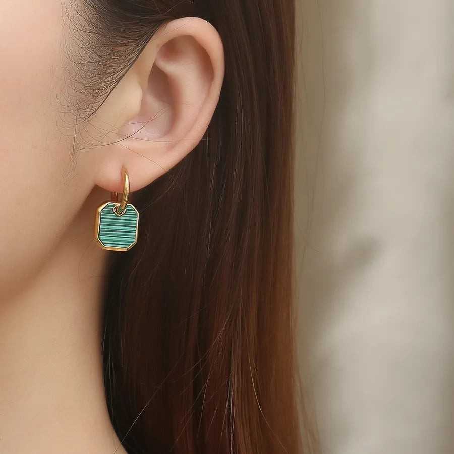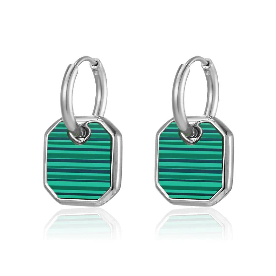 Enhance your elegance with these exquisite gold-tone hexagonal earrings featuring a captivating green striped design.