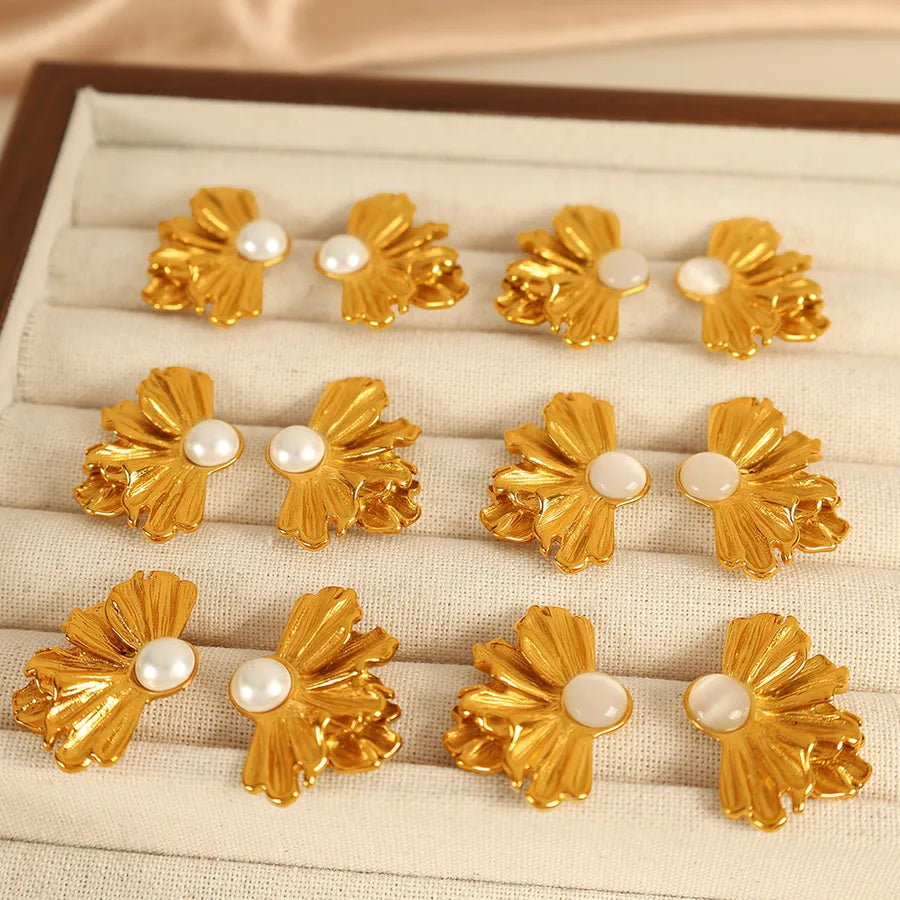 Elevate your elegance with our exquisite Floral Gold Pearl Stud Earrings.