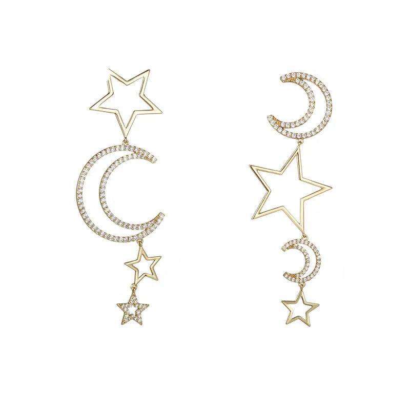 Embrace the celestial beauty with our enchanting Moon and Stars Asymmetrical Earrings. Crafted with precision, these earrings feature a delicate arrangement of stars and crescent moons, embellished with sparkling crystals that catch the light with every move.