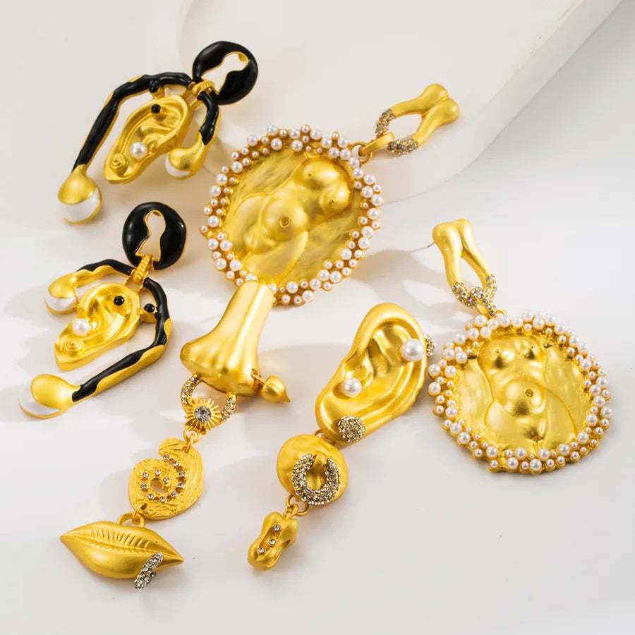 Crafted with precision, each earring showcases a blend of intricate designs featuring golden and pearl embellishments.
