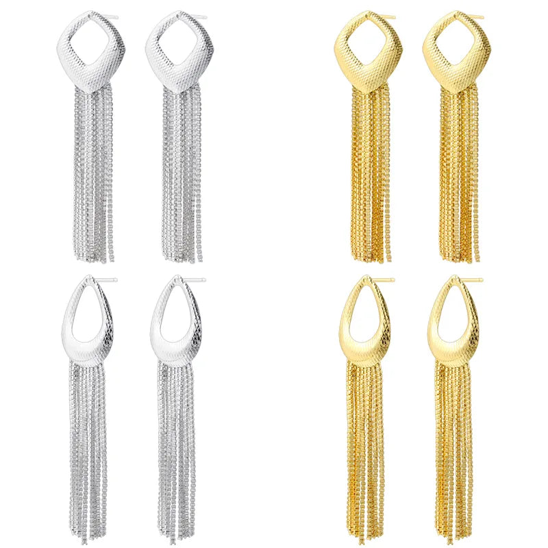 Elevate your style with these exquisite dangle earrings, featuring a luxurious cascade of shimmering chains.