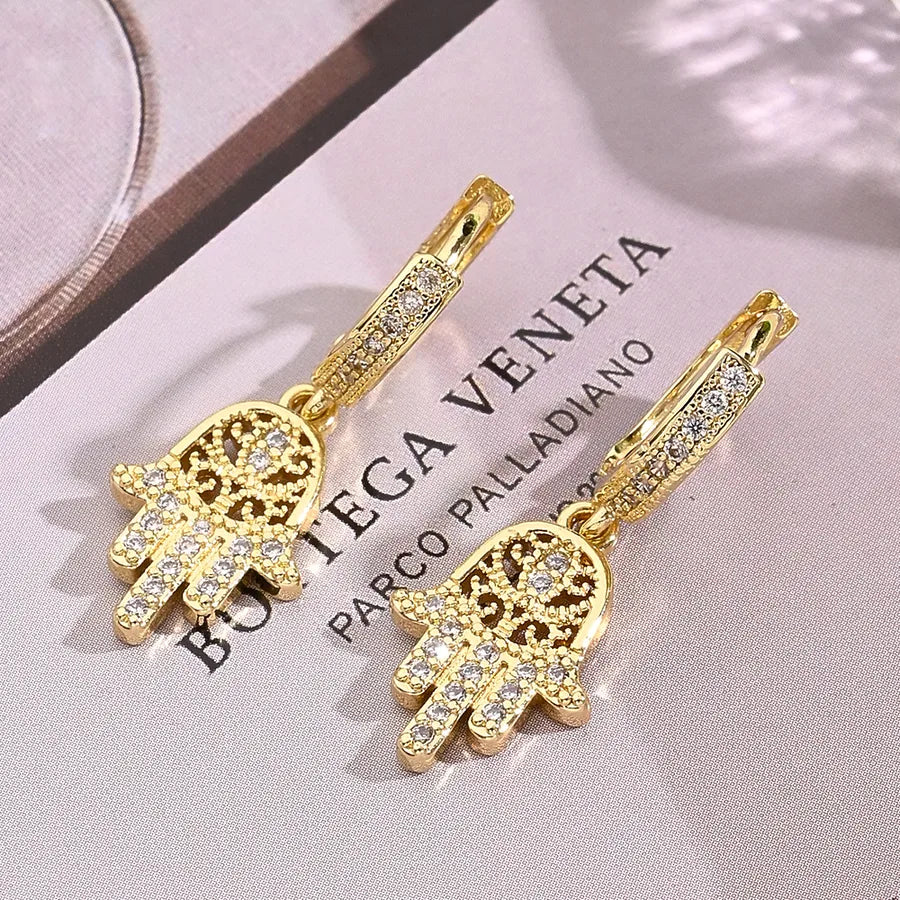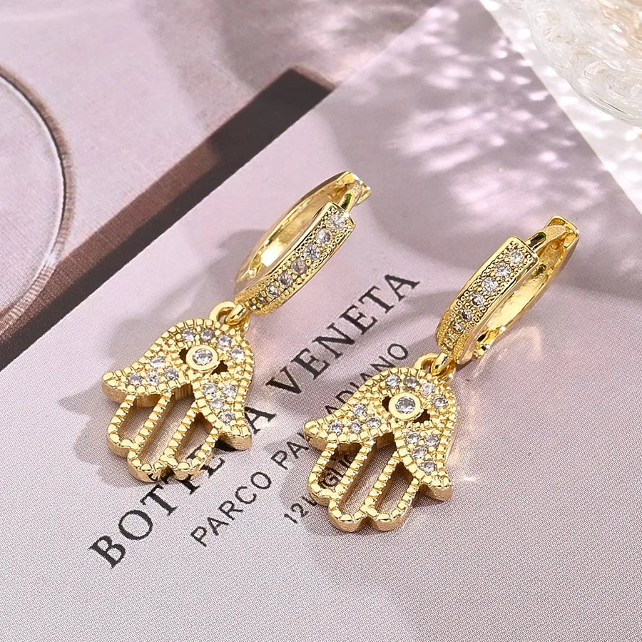 Elevate your jewelry collection with our exquisite Hamsa Hand Earrings, a symbol of protection and positivity. Crafted with precision, these elegant pieces feature shimmering crystals set in lustrous gold-tone metal, perfectly capturing light and attention.