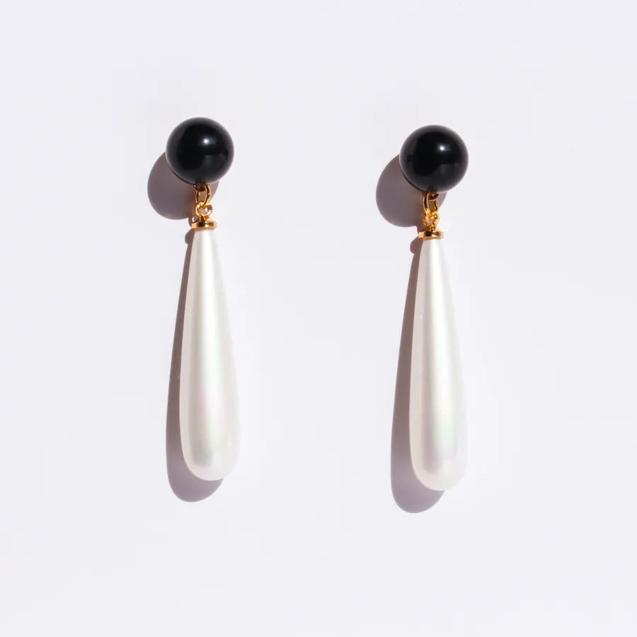 Embrace timeless elegance with these stunning drop earrings, featuring a sophisticated black bead stud and a lustrous white teardrop pendant.