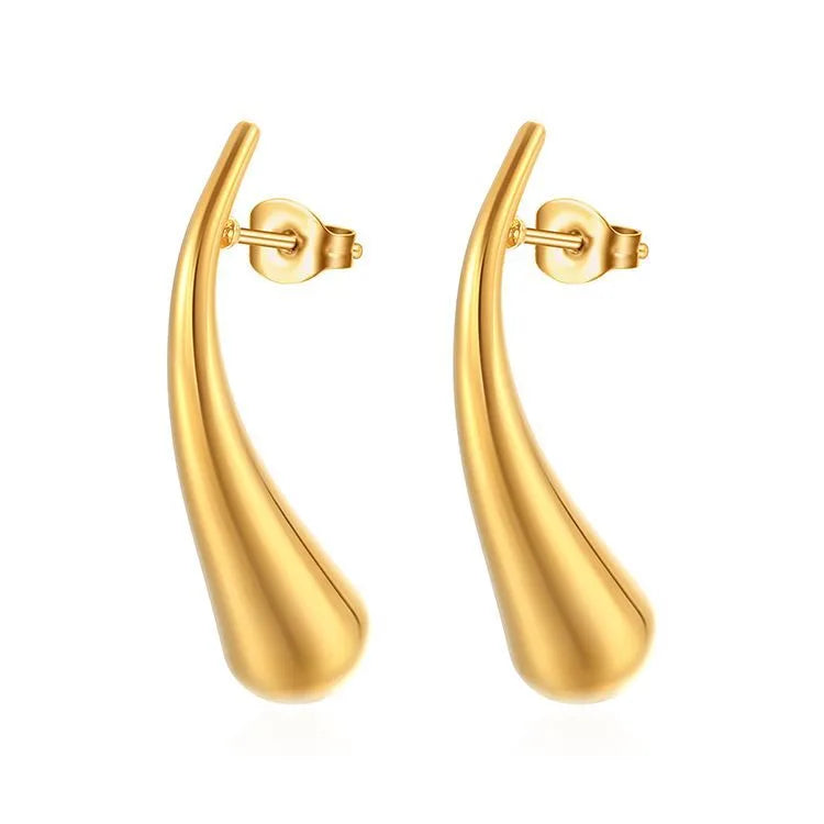 Each earring features a smooth, elongated teardrop design that offers a touch of modern sophistication to any outfit.