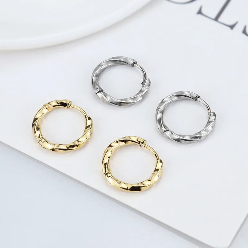 Each pair features a unique twisted design, offering a modern twist to the classic hoop.