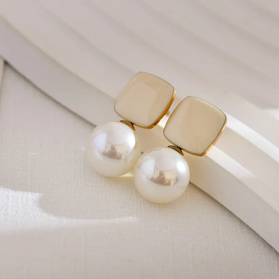 Discover elegance with our chic stud earring set, featuring vibrant pink and classic red squares paired with luminous pearls.