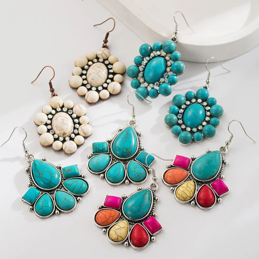 This stunning collection features an array of intricate designs, showcasing bold turquoise, creamy ivory, and playful multicolor stones. Crafted with precision, each earring in this set effortlessly captures elegance and personality.