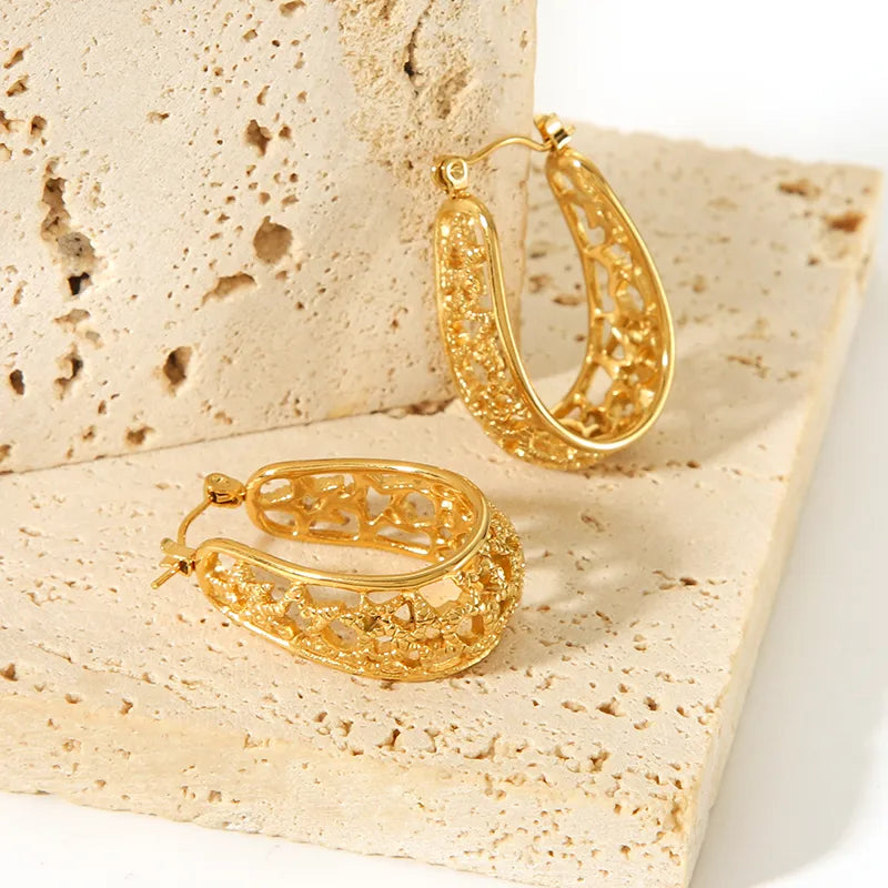 Elevate your elegance with these exquisite gold hoop earrings. Crafted with a delicate lattice pattern, they offer a timeless design that complements any outfit.