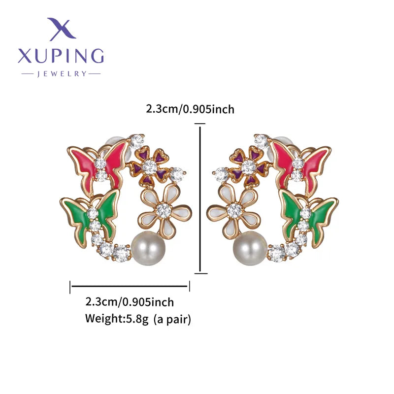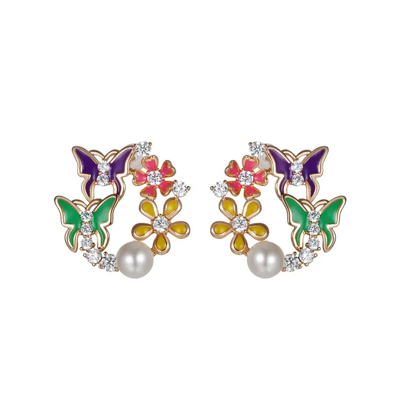 Design: These exquisitely crafted earrings feature a delightful ensemble of colorful butterflies and blooming flowers, all adorned with sparkling stones. A lustrous pearl adds a touch of sophistication and grace.