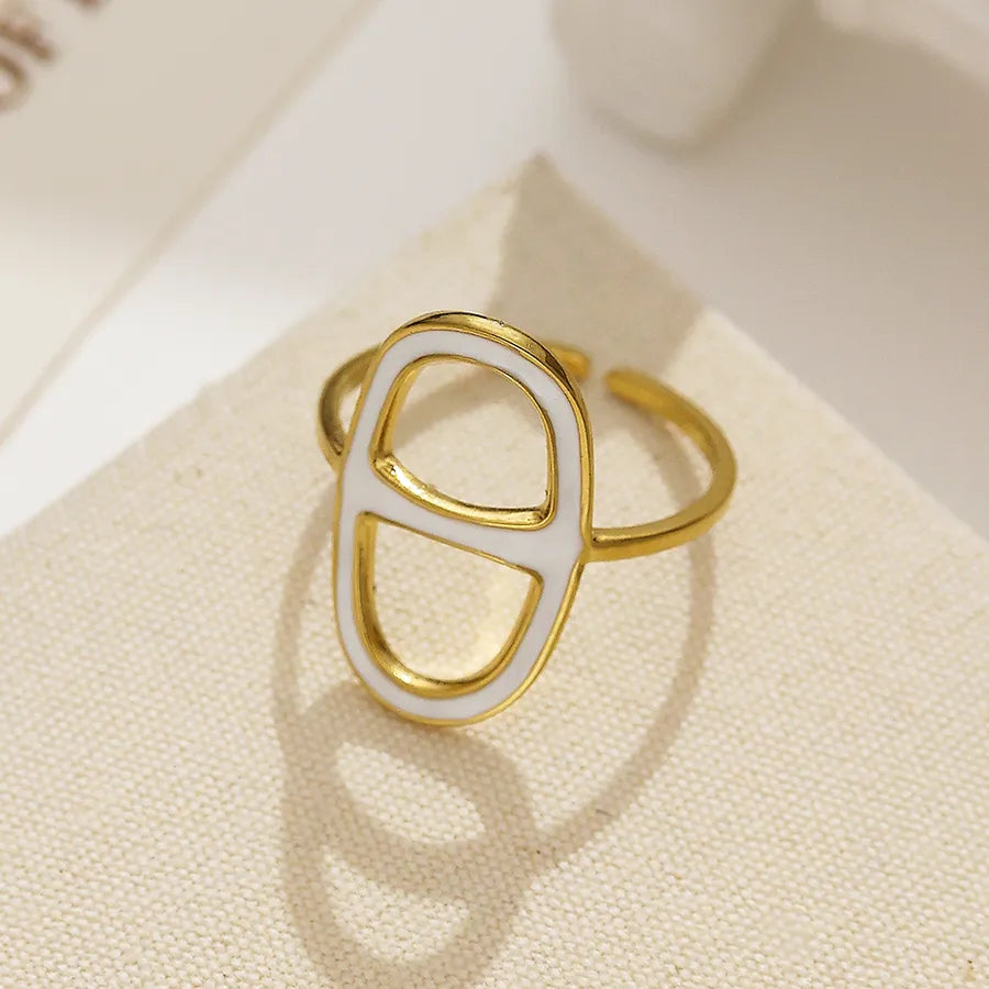 Crafted with precision, this ring features a unique open design, finished with a sophisticated white enamel that contrasts beautifully with the warm gold hue.