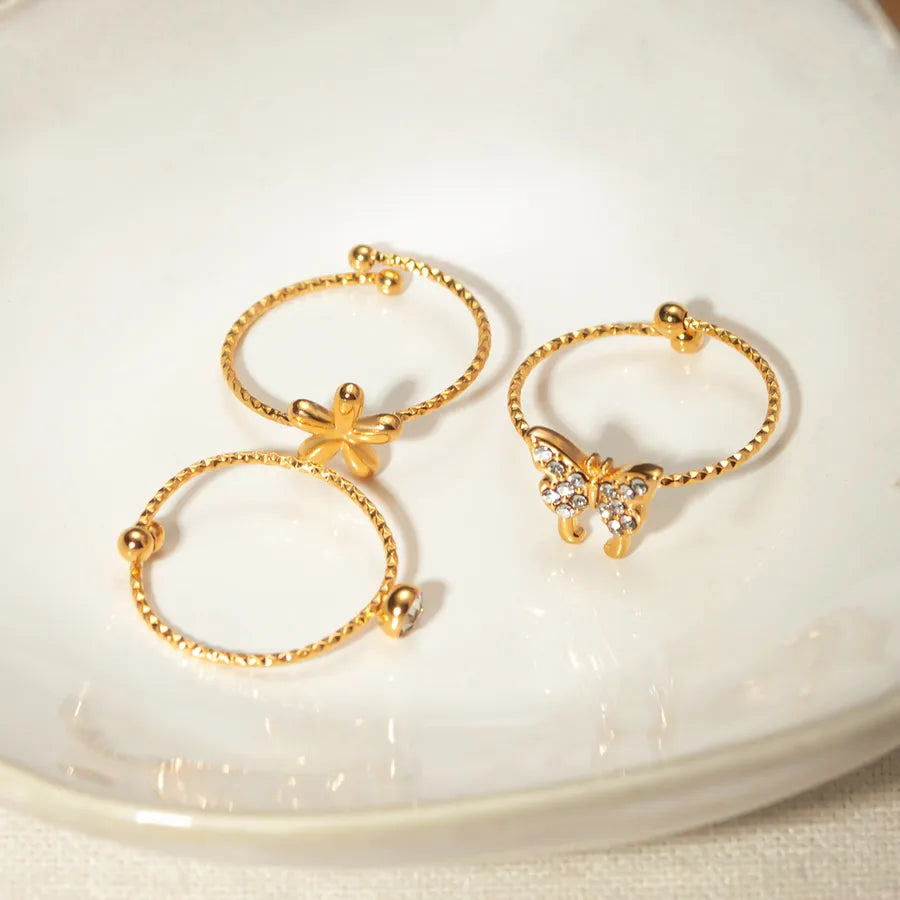 Elevate your style with our exquisite set of three gold-tone rings, featuring intricate designs crafted for the modern fashionista.