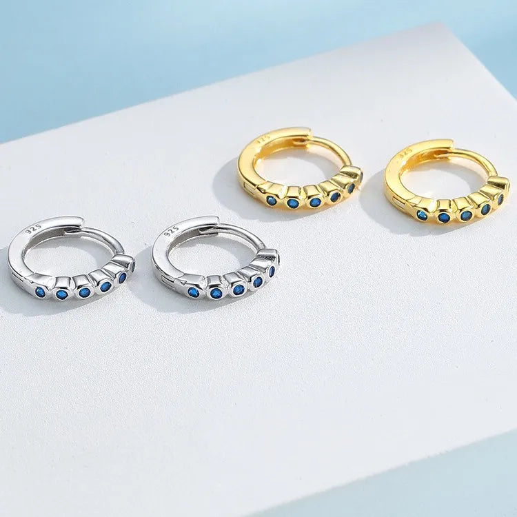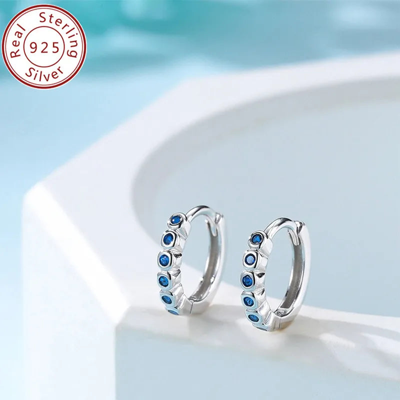 Each earring is crafted from high-quality 925 sterling silver, ensuring durability and lasting shine. The smooth hoop design is embellished with blue stones, adding a subtle yet distinctive flair.