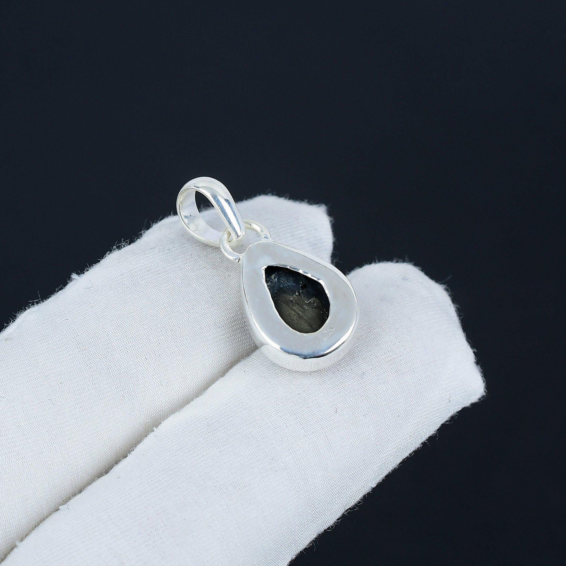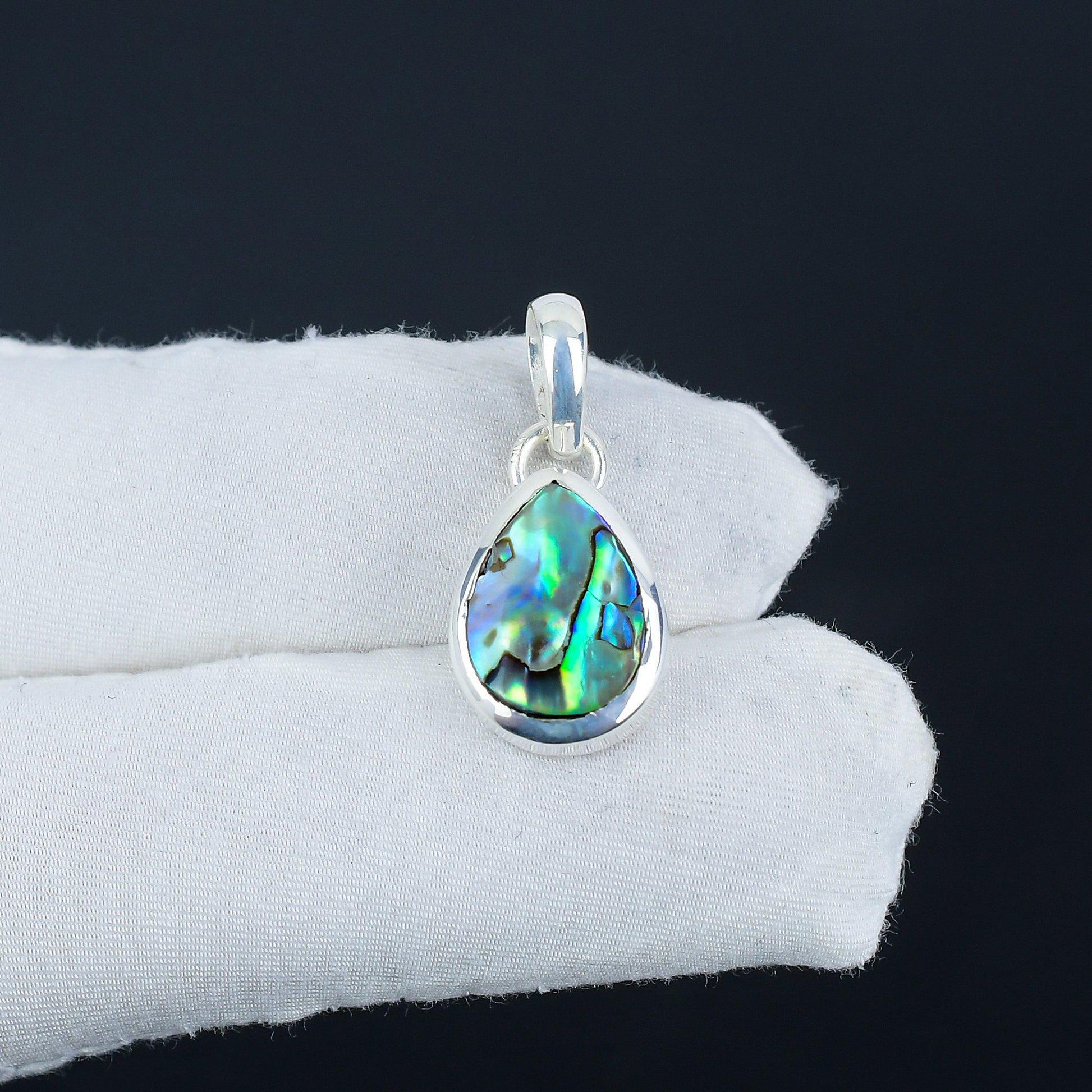 Featuring a vibrant, natural teardrop-shaped abalone shell, each piece boasts unique iridescent hues of blue, green, and hints of purple. Wrapped in a sleek sterling silver casing, this pendant adds a touch of elegance to any outfit.