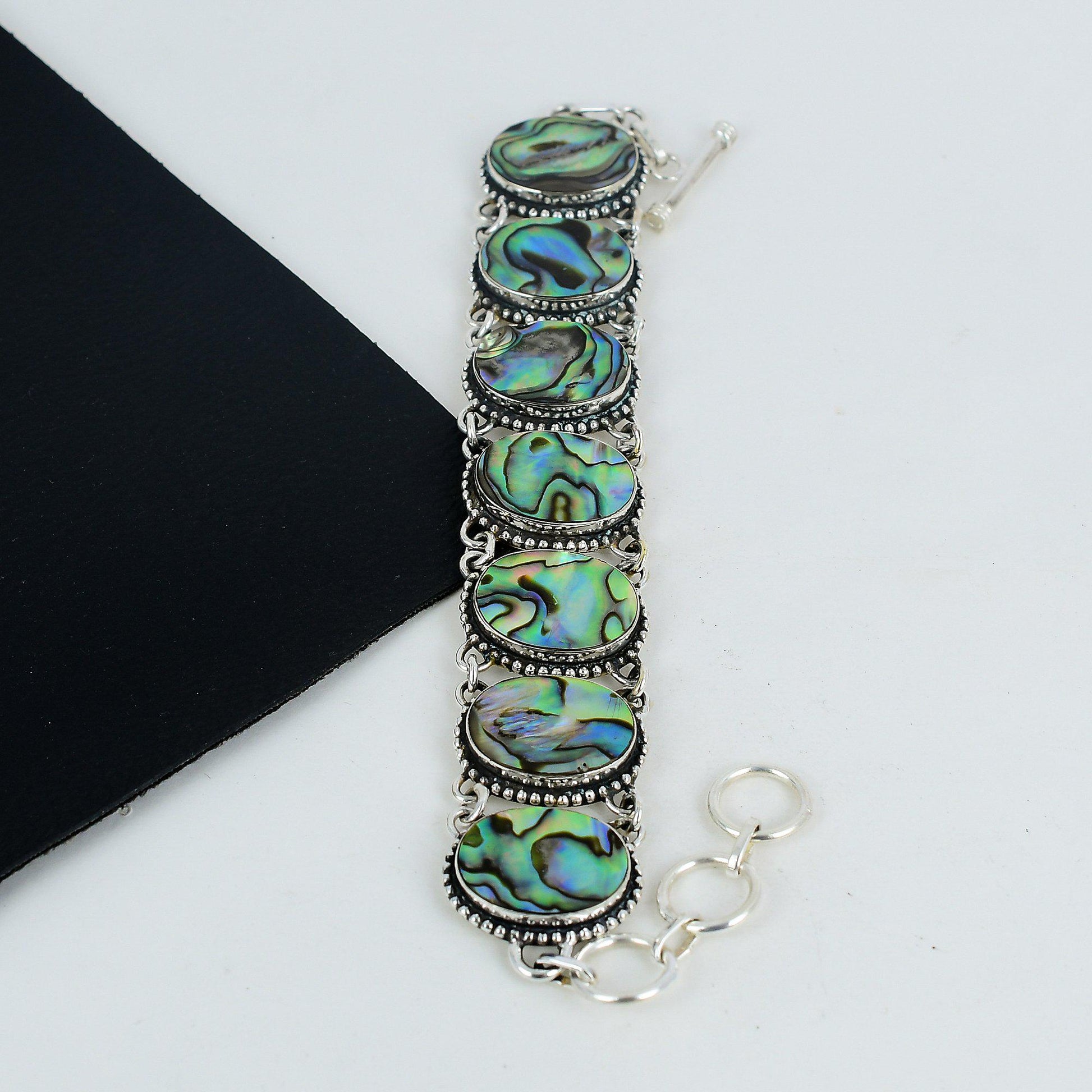 Embrace elegance with this exquisite Abalone Shell Bracelet, designed to captivate and enchant. Crafted with intricate detailing, each oval shell is framed with a delicate silver outline, highlighting its natural iridescence.