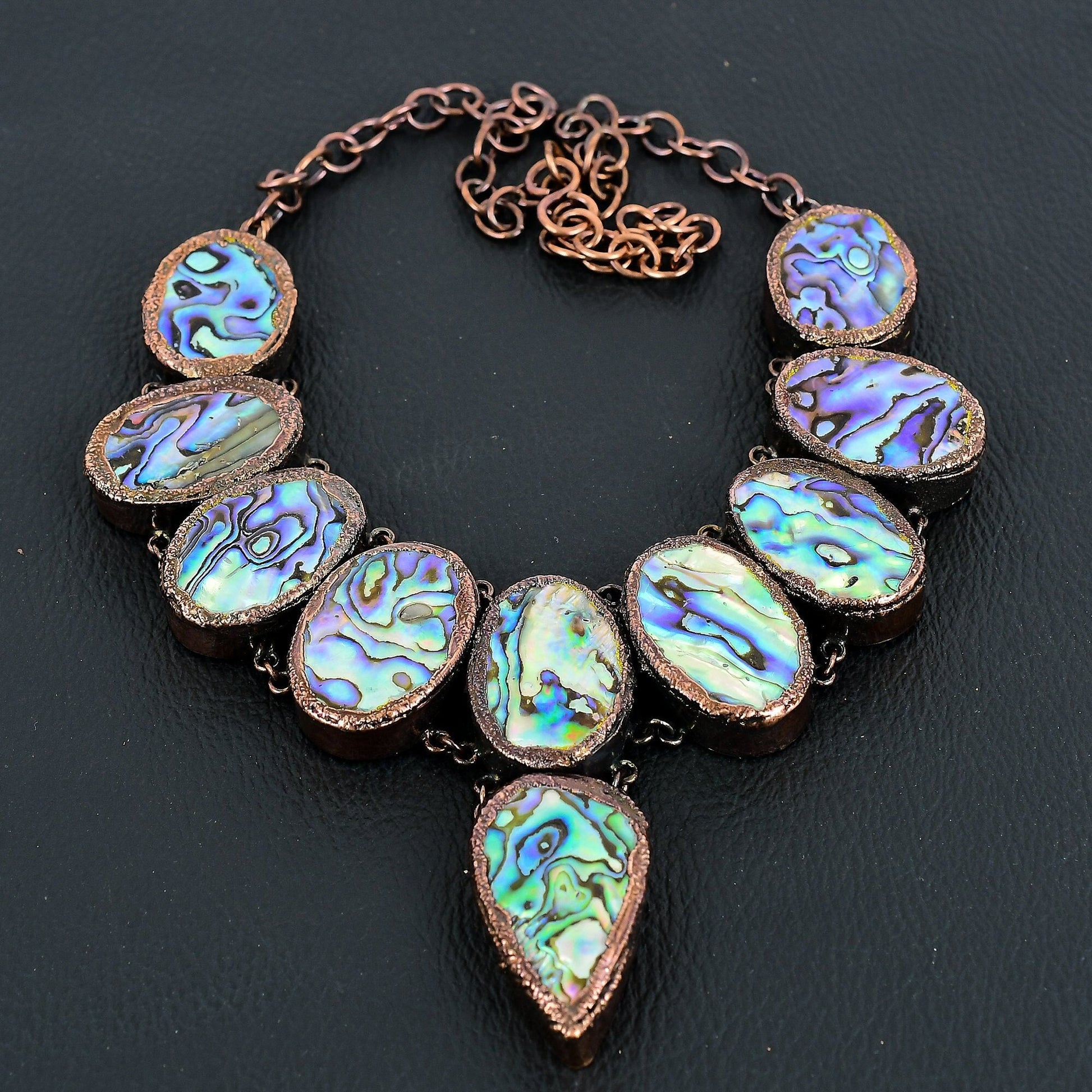Transform your style with this exquisite statement necklace, featuring a stunning array of iridescent abalone shells, meticulously set in antique copper bezels.