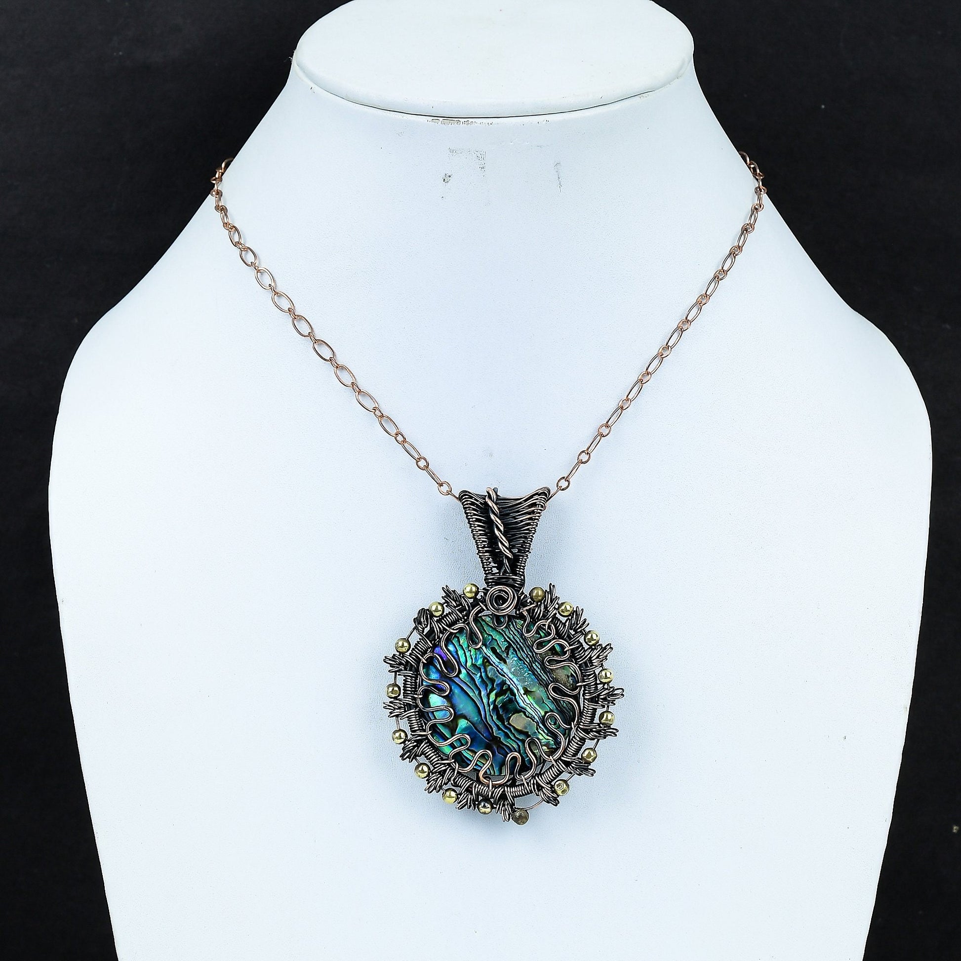 The intricate wire wrapping is crafted with care, ensuring durability while showcasing a harmonious blend of copper and brass tones that perfectly complements the shell's natural beauty.