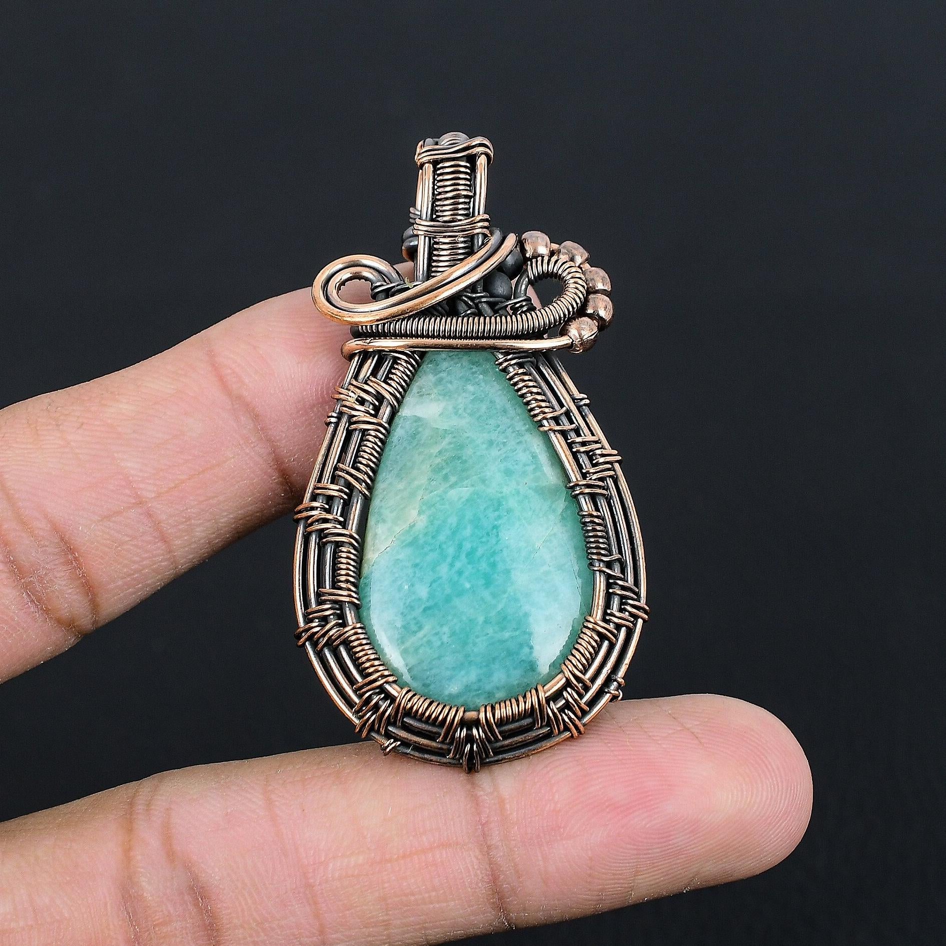 Featuring a mesmerizing teardrop-shaped Amazonite stone, this pendant is meticulously wrapped in intricate, antique-style copper wire, creating a unique and timeless piece.