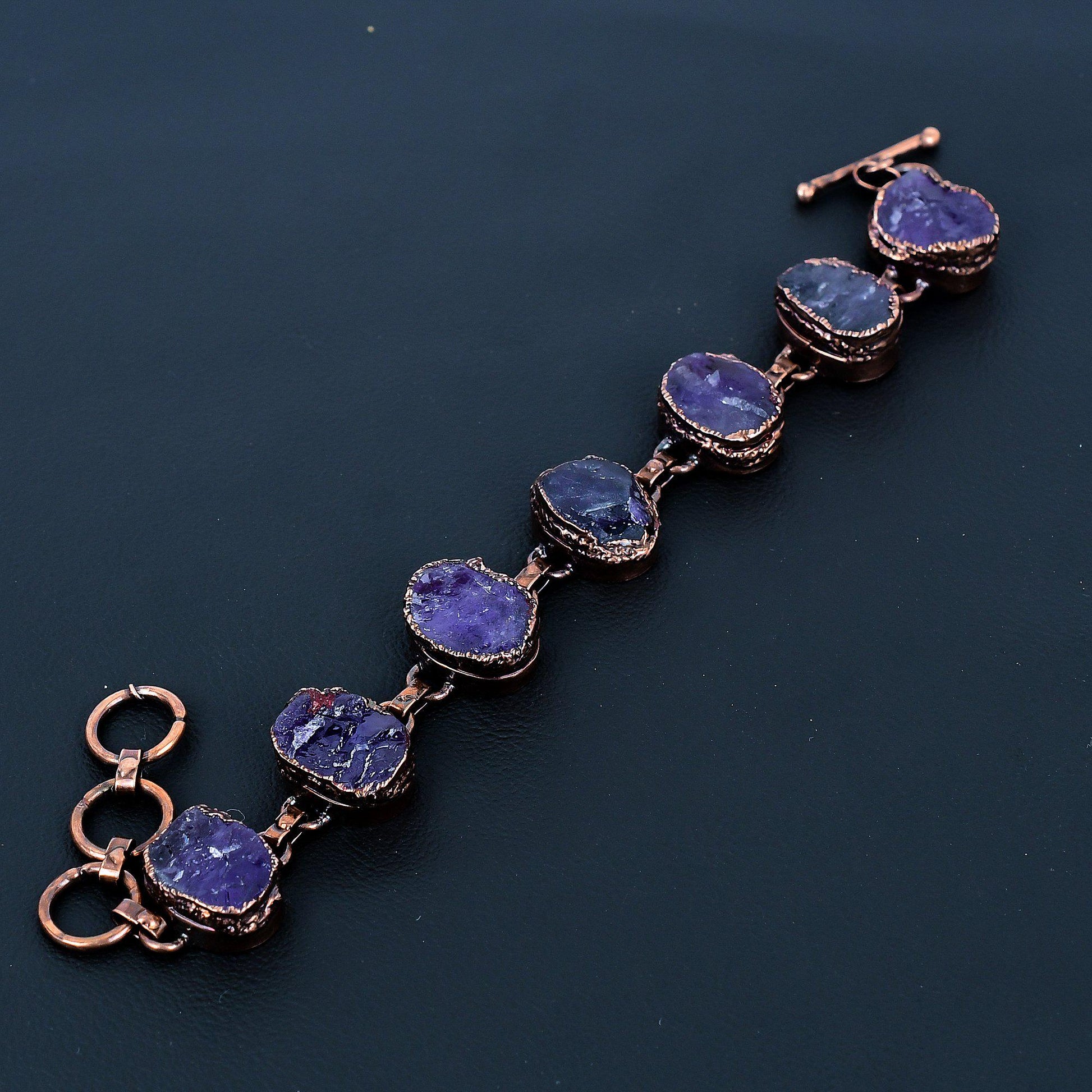 Elevate your style with this exquisite handcrafted bracelet, featuring raw amethyst stones set in a unique copper framework. Each stone is naturally shaped, offering a truly organic and one-of-a-kind appearance.