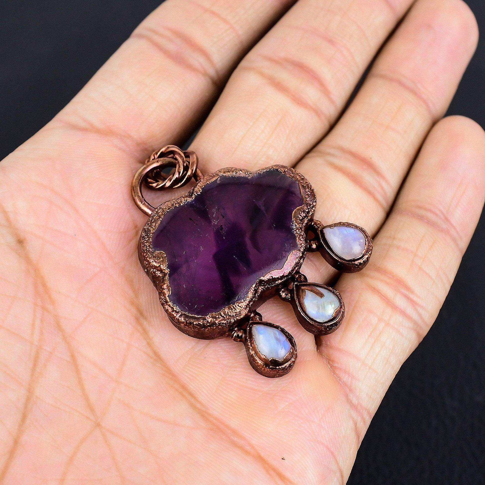 The natural variations in the amethyst and moonstones ensure each pendant is truly unique.
