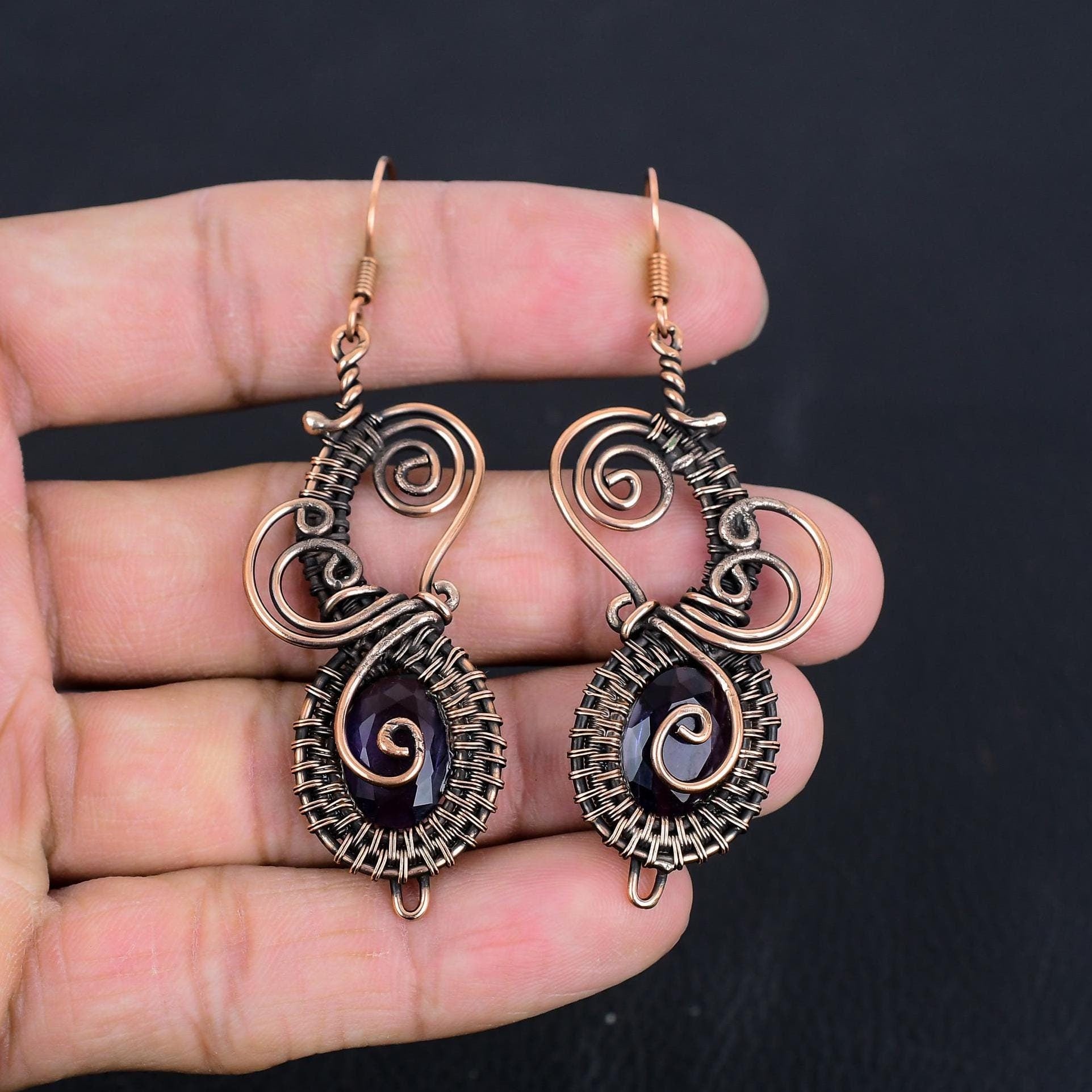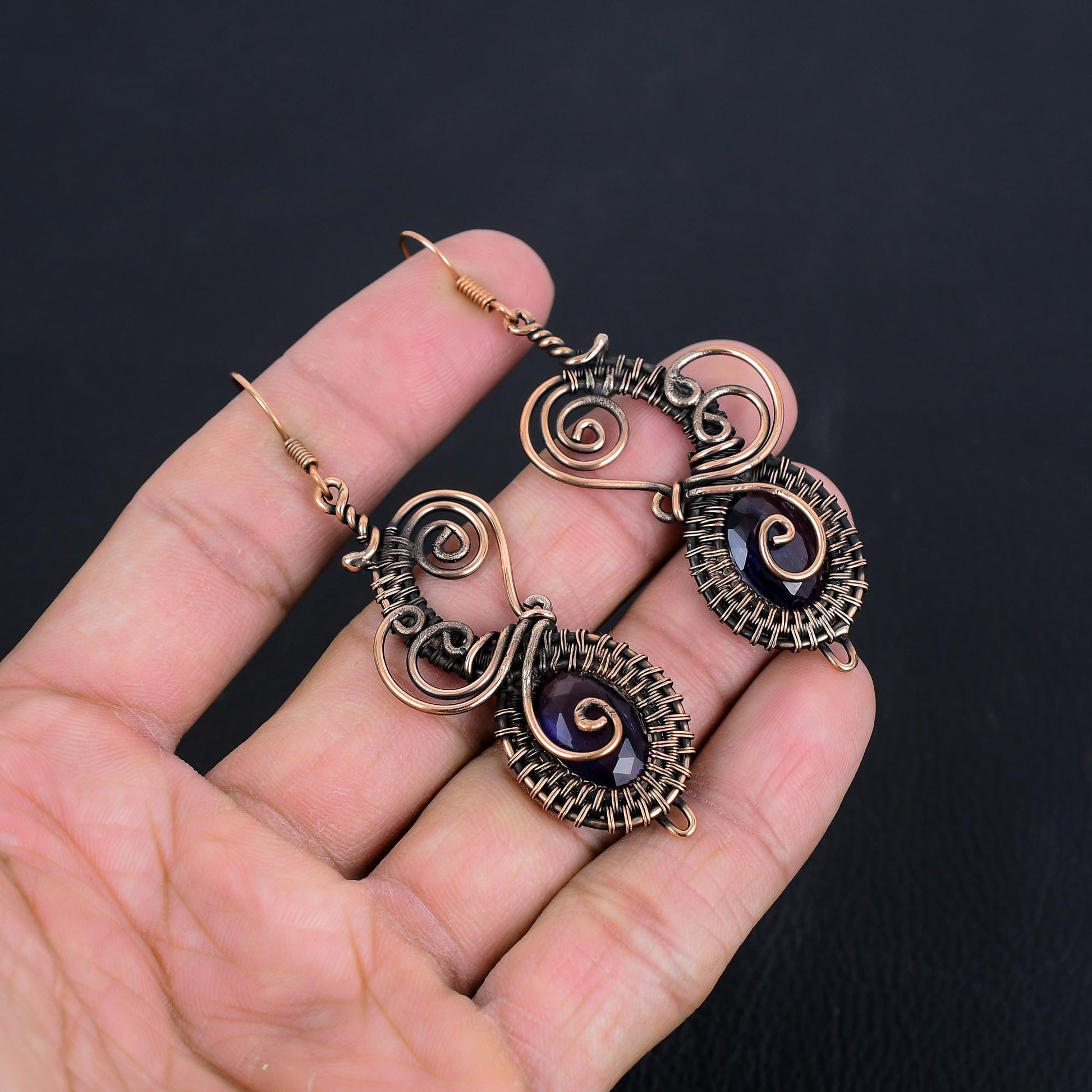 Design: Featuring intricate copper wire spirals and an enchanting dark gemstone at the center, these earrings are designed to make a statement.
